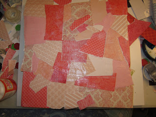 I tore patterned paper in various shades of pink. I used Mod Podge to cover the canvass.